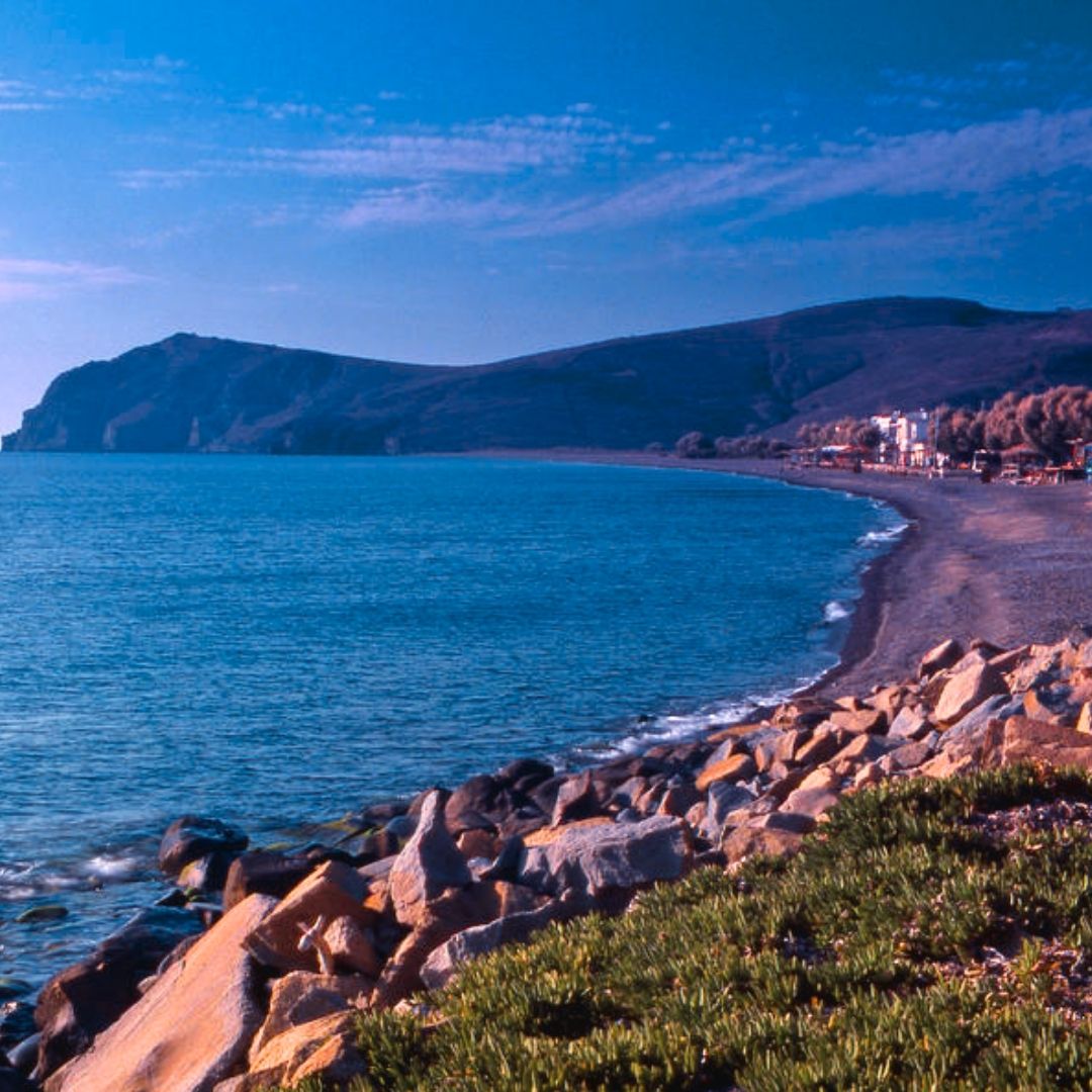 Midilli’nin en uzun plajlarından biri olan Skala Eresou, volkanik kumları ve sakin deniziyle dikkat çeker.